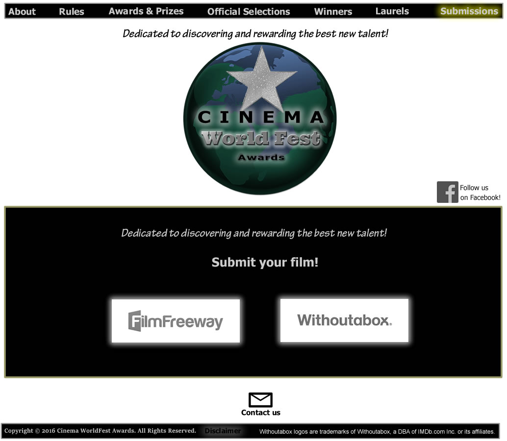Join us on Facebook! CWFA Home page Disclaimer hello@worldfestfa.com Laurels Submissions Official selections Winners Rules & terms Awards & prizes About us WithoutaBox FilmFreeway
